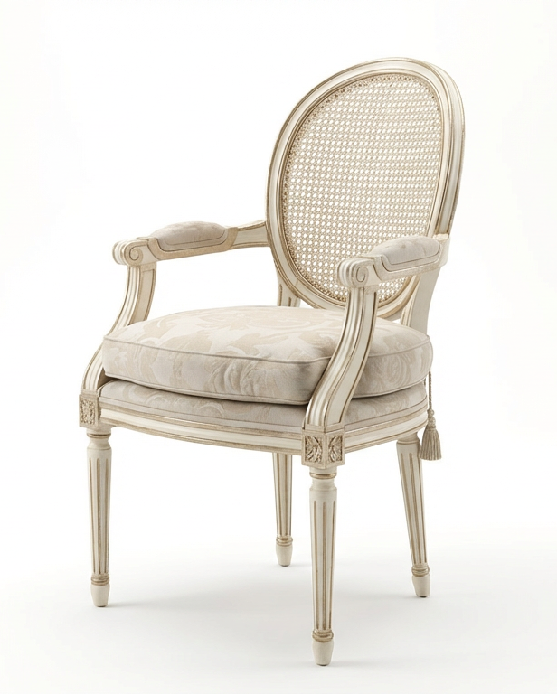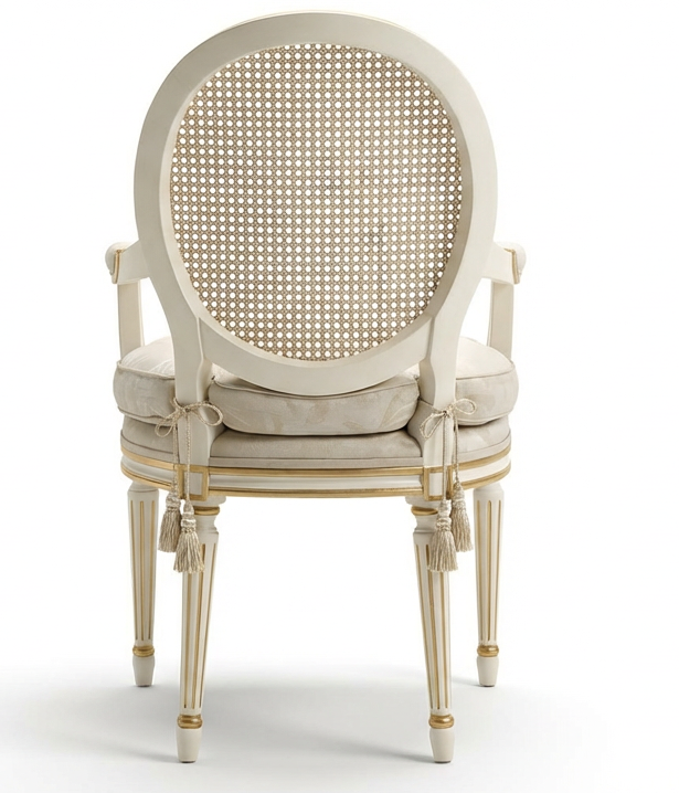 Louis XVI dining chairs—cane-back armchairs with silver stenciling